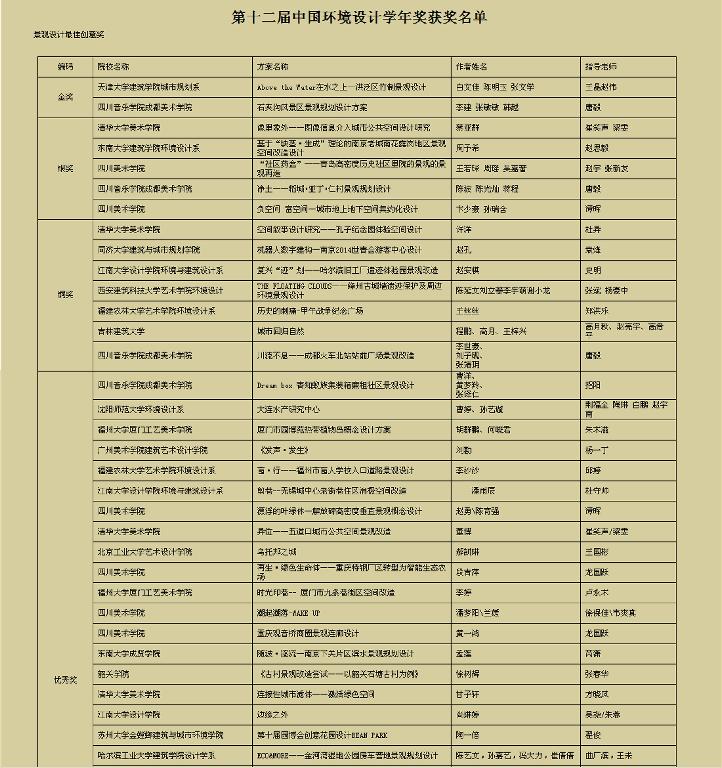 芮潇老师所带的10级环境设计毕业生孟莲同学的名为《随波•逐流—南京下关片区滨水景观规划设计》毕业设计分别荣获了,2014第三届中国环境艺术青年设计师作品展景观规划设计奖本科组优秀奖、首届青龙国际社区大学生创意设计大赛景观小品设计组一等奖(奖金10000元),同时也荣获环境艺术设计类学生最具权威的全国性竞赛——第12届中国高等学校环境设计学年奖最佳景观景观类优秀奖(附获奖名单图片)。