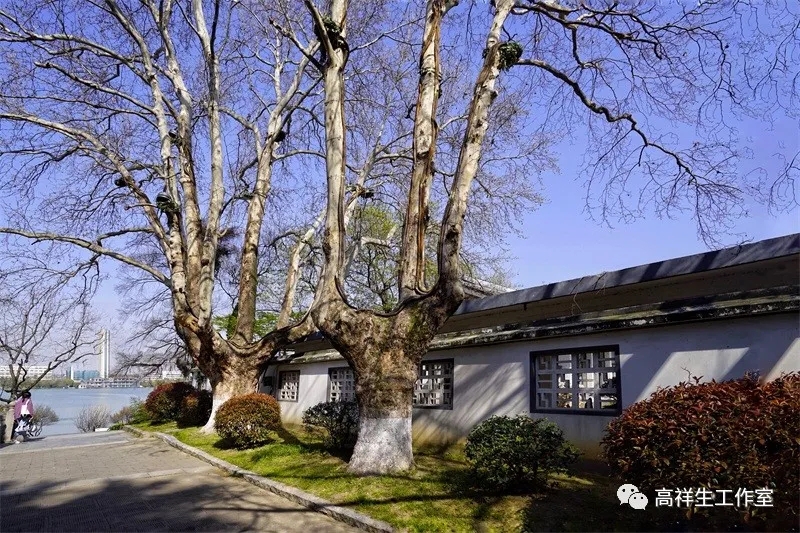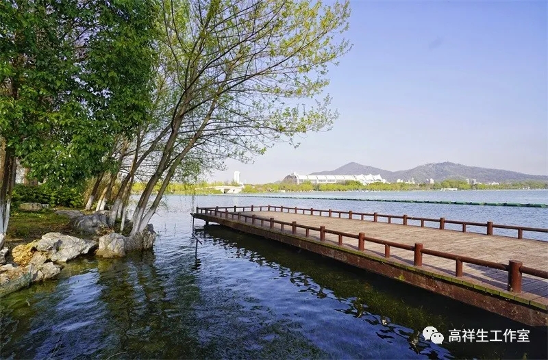 湖岸的空地上植满了观赏树,有成片的樱花,也有零星的梅花、桃花、杏花……岸边的凉亭、长廊中通常都有休闲的人们,有的在聊天、品茶,有的在棋盘上对弈,……亭边常有嬉闹的儿童和练气功、打太极的老人。