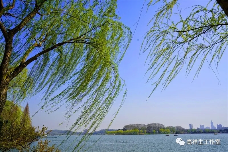 湖风是细微的,吹到身上有些湿润,但是温和的。春风拉动千百条嫩绿的柳条,摇曳了岸边金黄的迎春花。