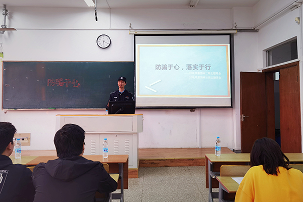 4月19日晚,学院邀请泰山新村派出所陆建兵警官和陈轶伟警官来到2020级学生主题班会现场专程指导开展校园防诈骗宣传活动。陆警官以“全覆盖、无盲区、人人皆知”为准则,分析辖区内电信诈骗案件的类型特点,并结合工作中遇到的真实案例,深入浅出地分析了各类通讯网络诈骗手段的特点,提醒大家提高辨识力和防范力。陈警官结合常见诈骗手法进行了条分缕析的解读,揭示了事发时犯罪嫌疑人和当事人的心理变化及行为逻辑,指出了预防通讯网络等诈骗的关键所在。随后,警官为大家分发防诈骗宣传传单。