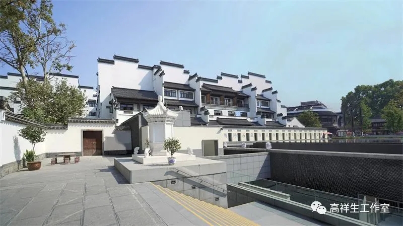 科举博物馆主体长36米,宽36米,高20米,整体沉入地下,上部设方形浅水池。贡院牌坊与明远楼相对而望,博物馆入口浅水池如同一面晶莹剔透的镜面,将明远楼和毗邻的建筑的粉墙黛瓦,蓝天成荫收纳其中。(图1、2)