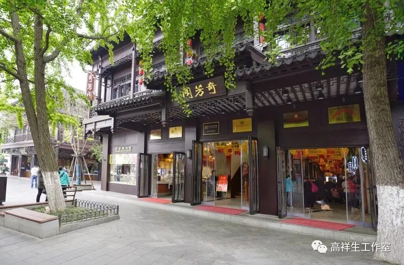 原贡院街的商铺在减少,而在大石坝街的商铺,特别是餐饮建筑增加了。在这里有晚晴楼、天圆楼、老盛庆、金陵春、秦淮人家、咸亨酒店等大石坝街的商铺更加注重了商铺的细部装饰,大多采用回字纹、万字纹。店招一律由名家书写,店招的形式多数竖向布置……都是新中式风格。很显然大石坝街商铺的风格也延续了东市、西市的商铺风格。
