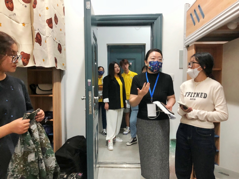 为了让挥别家人的新生感受到“艺”家人的爱意和温暖,我们为每一位新生精心设计了印有学院标识的口罩和文件袋,为每一间新生宿舍大门贴上了玫瑰花,还请每一位新生在迎新照片墙拍照留念。新生辅导员江晶老师走访了新生宿舍,了解新生对新环境的适应情况。