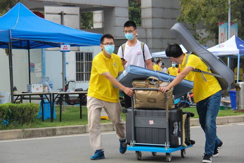 我院迎新工作人员及志愿者,在按要求做好疫情常态化防控工作的同时,为新生提供温馨体贴的服务。身穿黄色工作服的他们,来回奔走于报到点与宿舍楼之间,如同金秋十月里一缕缕送爽的秋风,传递学院温情,尽显人文关怀。