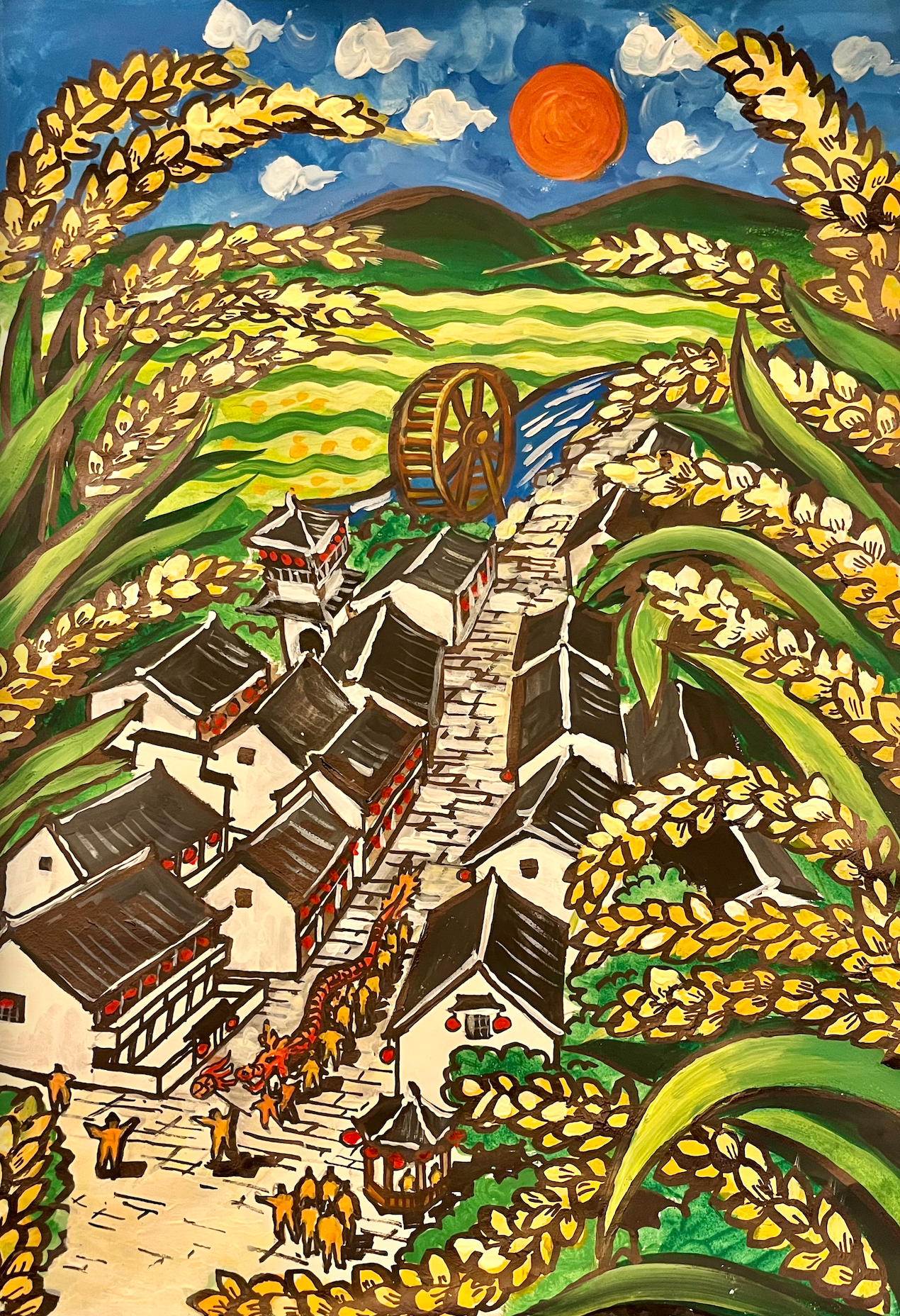在以“美丽乡村”为主题的农民画决赛中,李响老师现场创作了农民画《禾下乘凉梦——新农村风貌》,其灵感来自“杂交水稻之父”袁隆平对杂交水稻高产的不懈追求:画面中高大饱满的水稻为秀美的村落洒下一片清凉,村民们幸福地舞起了长龙,寓意以袁隆平教授为代表的仁人志士为农村的振兴和发展作出了伟大的贡献,预示着农村的生活将会越来越好,越来越惬意。
