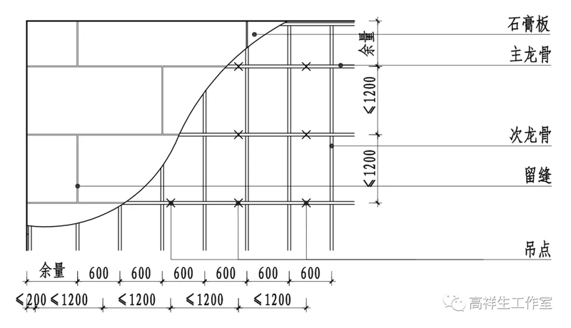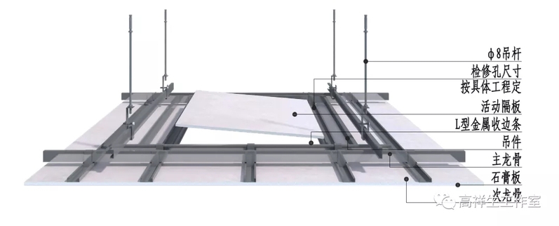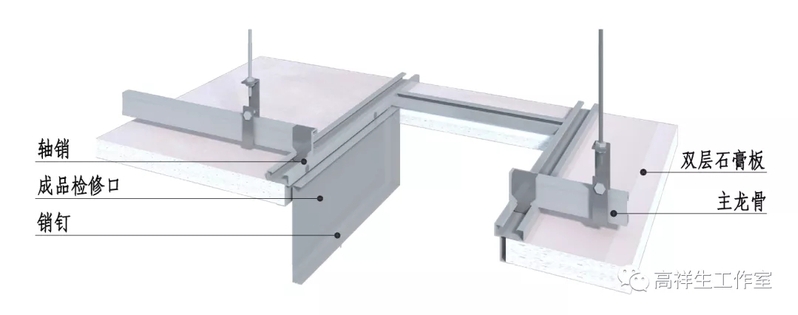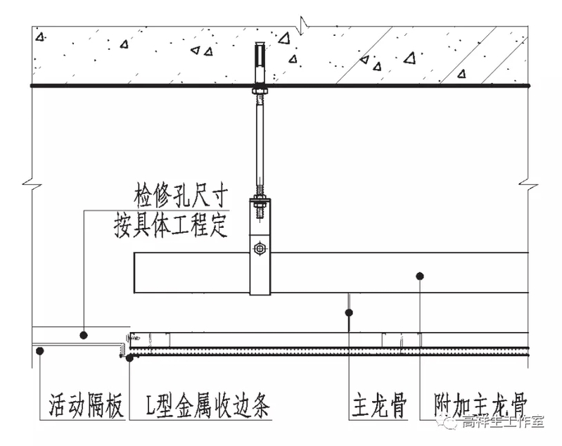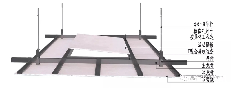 ⑤ 按承载能力分有上人式顶棚和不上人式顶棚。上人式顶棚要求有较大的强度与适当的内部空间,主龙骨要能承受 80 ~ 100 kg 的荷载,顶棚上部的空间高度应为 0.9 ~ 1.5 m。同时需预留检修孔,设具有足够强度的检修道。不上人式顶棚上部空间的高度相对较低,龙骨的荷载力亦可适当降低。