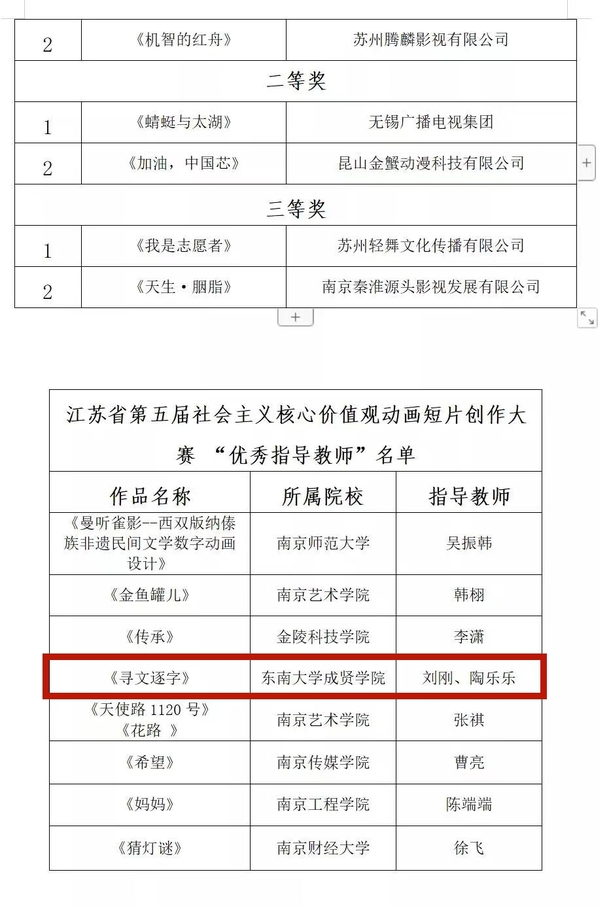 大赛由省广电局、省教育厅主办,南京艺术学院传媒学院、省影视动漫协会、省广电总台优漫卡通卫视联合承办,自今年3月启动以来,大赛共收到参评作品200多件。经评审,我院选送的动画作品《寻文逐字》荣获“一等奖”,刘刚、陶乐乐2位教师被评为优秀指导教师。获奖作品体现了我院青年动画创作者们对弘扬社会主义核心价值观的责任与情怀,他们用生动有趣的动画形式对我国社会主义核心价值观做出了美好诠释。
