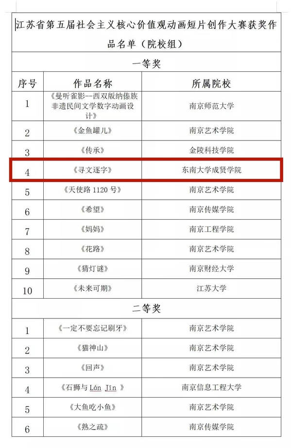 11月15日,江苏省第五届社会主义核心价值观动画短片创作大赛颁奖活动在2022长江新视听大会开幕式上举办,现场公布了大赛院校组一二三等奖动画短片各10部、社会组一二三等奖动画短片各2部。