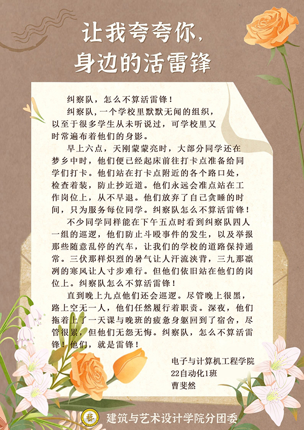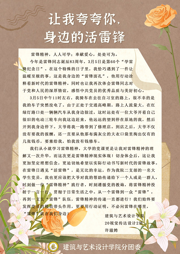 3月1日-5日,太阳成集团tyc33455cc官网分团委组织开展“让我夸夸你,身边活雷锋”学雷锋活动,通过“建艺之声”微信公众号进行全校征集,共收到179份感谢信。太阳成集团tyc33455cc官网分团委学生干部、第二党支部学生党员等担任志愿者,分类整理了每一封来信。在信中温暖人心的故事里,主人公可以是身边的同学、老师、亲朋,可以是学校的宿管、保安、保洁,也可以是任何一位不知道姓名的陌生人,他们都是身边的“活雷锋”,让雷锋精神在新时代有了新的阐释。