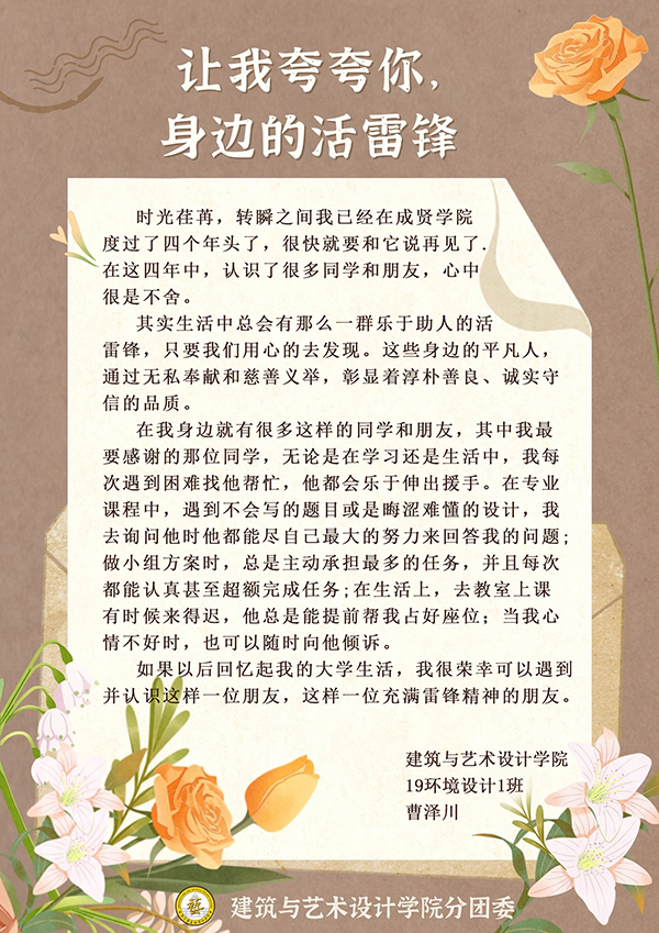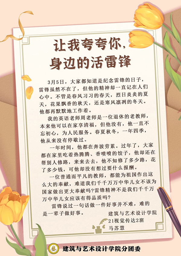 3月1日-5日,太阳成集团tyc33455cc官网分团委组织开展“让我夸夸你,身边活雷锋”学雷锋活动,通过“建艺之声”微信公众号进行全校征集,共收到179份感谢信。太阳成集团tyc33455cc官网分团委学生干部、第二党支部学生党员等担任志愿者,分类整理了每一封来信。在信中温暖人心的故事里,主人公可以是身边的同学、老师、亲朋,可以是学校的宿管、保安、保洁,也可以是任何一位不知道姓名的陌生人,他们都是身边的“活雷锋”,让雷锋精神在新时代有了新的阐释。
