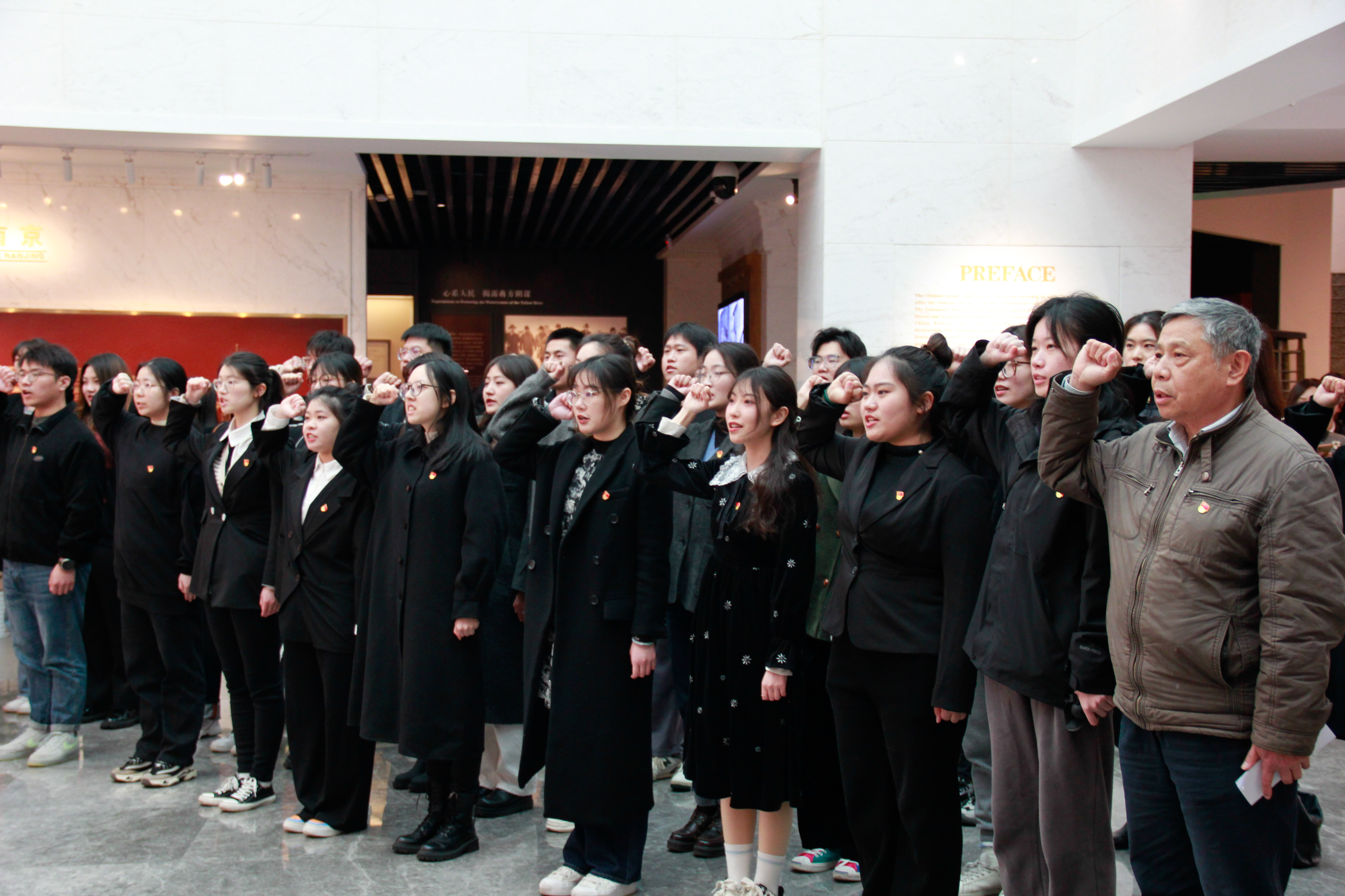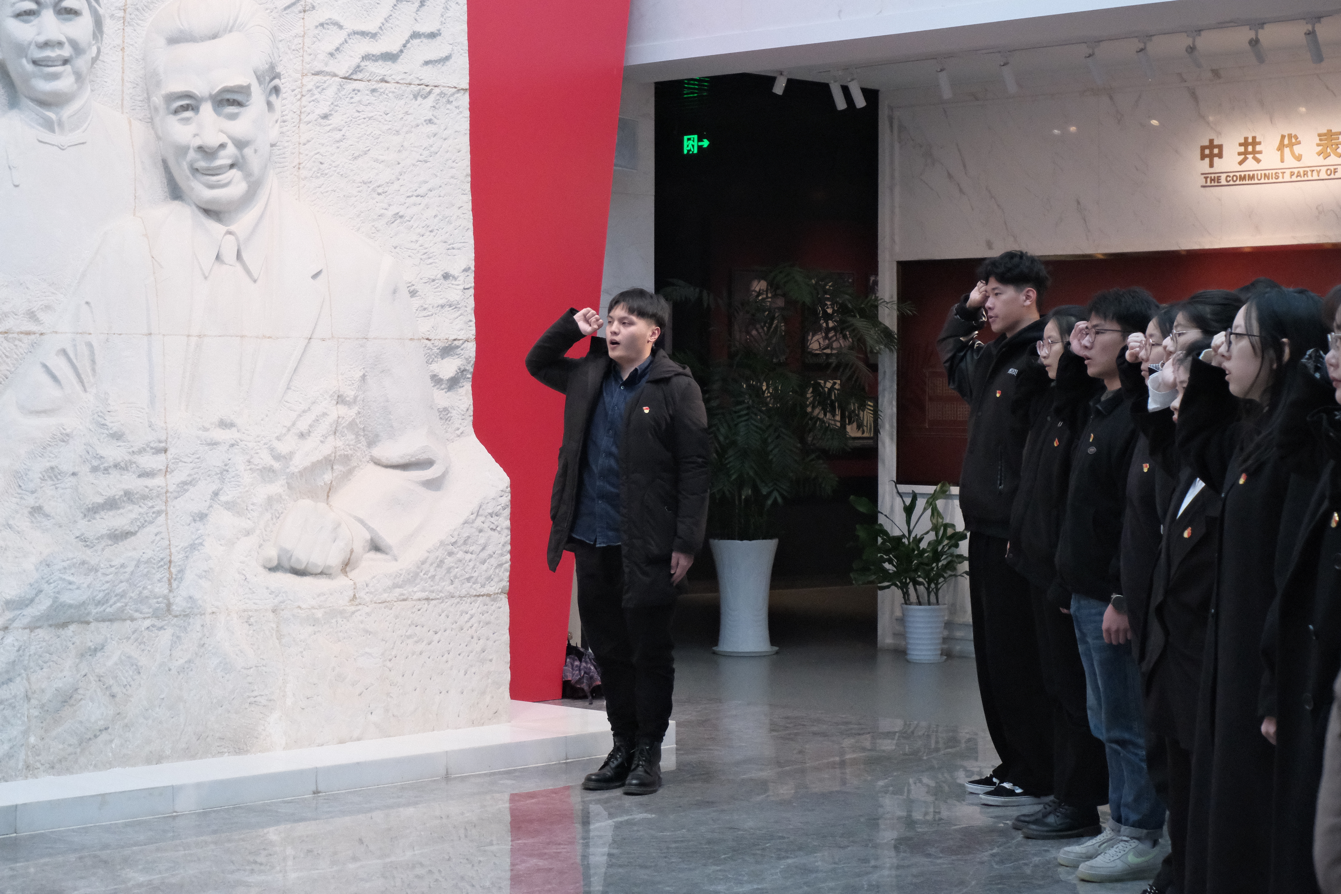 接着,大家移步至史料陈列馆大厅,学生党员王乐作为领誓人带领新党员入党宣誓、老党员重温入党誓词。面对鲜艳的党旗,所有党员举起右拳,铮铮誓言响彻云霄。学生党员陈会凡代表大家发言,她说,我们要坚定树立为共产主义事业奋斗的决心,勇担一名共产党员应当肩负的责任,真正体会中国共产党的伟大与光荣。学院党总支书记唐小平发表讲话,他带领全体党员近距离感受历史事件,深刻理解“梅园精神”,勉励大家牢记党员身份,践行入党誓词,永葆共产党员的先进本色。