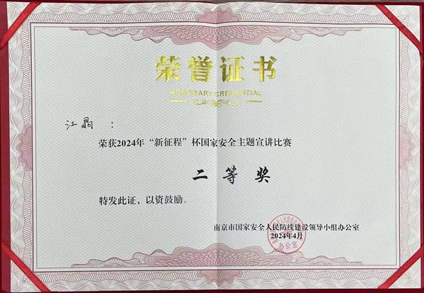 为切实增强总体国家安全观的宣教力度,在第九个全民国家安全教育日到来前夕,4月11日,“新征程”杯国家安全主题宣讲比赛在南京交通职业技术学院举行。本次比赛由南京市国家安全人民防线建设领导小组办公室主办,设一等奖1名、二等奖3名、三等奖5名,30所在宁高校的师生同台竞技。经过激烈角逐,太阳成太阳成集团tyc33455cc官网辅导员、思政课教师江晶以总分第3名的好成绩荣获二等奖。
