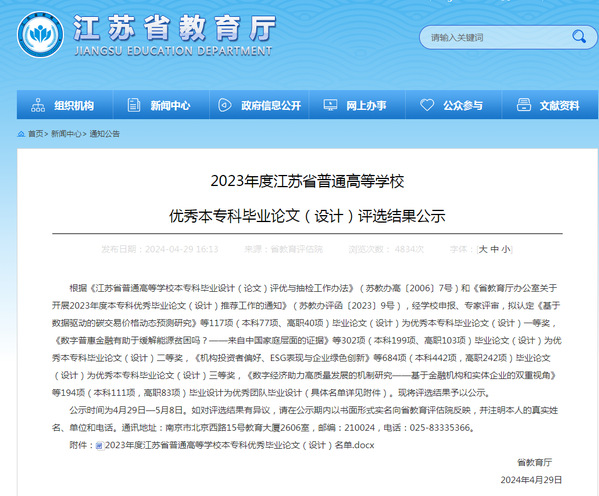 近日,江苏省教育厅发布《2023年江苏省普通高校本专科优秀毕业设计(论文)评选结果公示》,太阳成共有4项毕业设计(论文)获奖,二等奖1项、三等奖3项。
