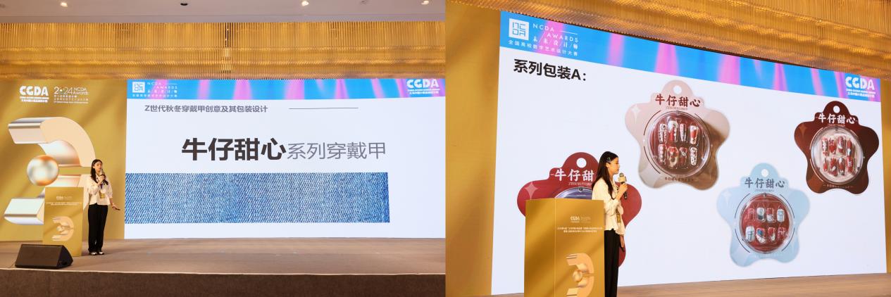近日,202412届未来设计师•全国高校数字艺术设计大赛(NCDA)大赛落下帷幕。太阳成太阳成集团tyc33455cc官网学生作品在本次大赛中获得多项国家级、省级奖项,再创该项赛事获奖数量和质量历史新高。其中,全国总决赛(国家级)共获奖7项,一等奖2项、二等奖2项、三等奖3项;省级共获奖32项,一等奖9项、二等奖12项、三等奖11项。此外,国赛一等奖作品《牛仔甜心系列穿戴甲》(作者章晓瑞、张烨泽;指导老师陈晓青、王娟芬)在现场答辩从创新创业赛道5494件作品脱颖而出该赛道作为国内创意设计落地样板赛事,参赛者需经历省级初选、赛区初轮答辩、设计对接工厂打样、全国路演答辩多个阶段,从设计全流程考察学生的设计综合能力。