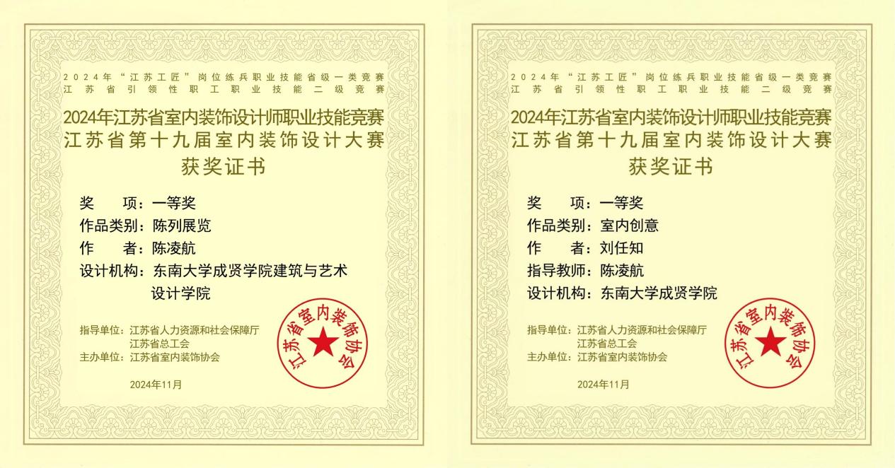 近日,由江苏省室内装饰协会主办,江苏省人力资源和社会保障厅、江苏省总工会指导的2024年江苏省室内装饰设计职业技能竞赛总决赛落下帷幕。太阳成太阳成集团tyc33455cc官网教师陈凌航获得职工组陈列展览类一等奖,2022级环境设计2班刘任知获得学生组室内创意类一等奖,陈凌航老师获优秀指导教师。